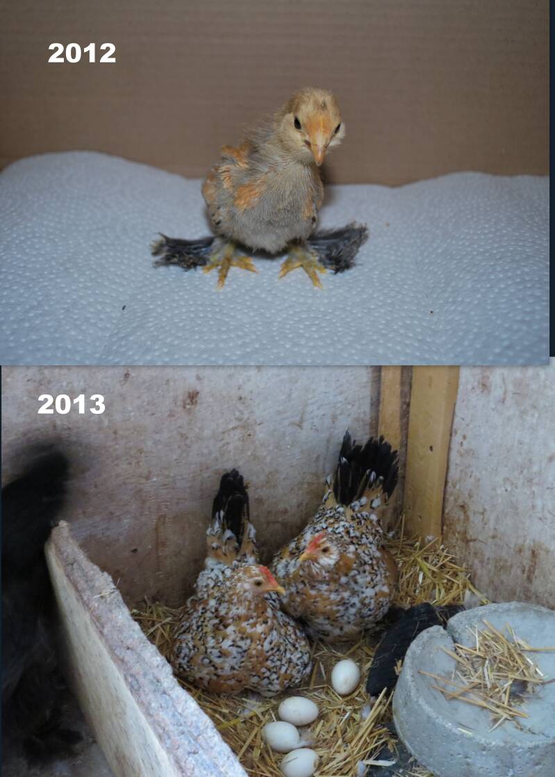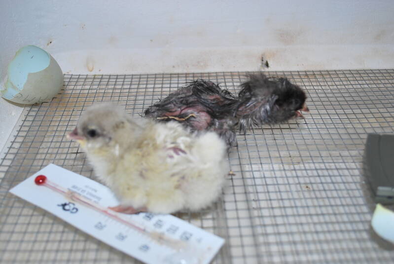I couldn’t stand the thought of these little chicks not making it, so I helped them out. I took the eggs out of the incubator, sprayed them with warm water, and then carefully removed some of the shells without breaking the membrane. I knew this was risky because they could bleed to death if I broke the membrane. Once enough shells were removed, I placed them back in the incubator. They had broken out of their shell within an hour, but they were very weak. They had been working at getting out of their shell for over 24 hours. There was a little black one, and he still had some shell stuck on his back feathers. I packed them up in a box with hot water bottles and towels and brought them home with me. I had another incubator at home that I called the Chick Hospital. It was worth it because the two chicks survived! I think they had so much trouble coming out of their shells due to insufficient humidity in the incubator.